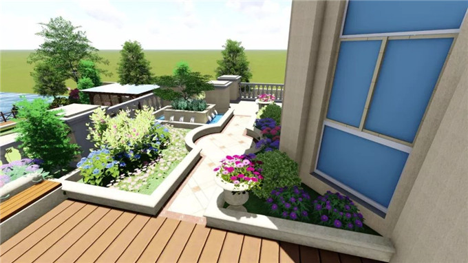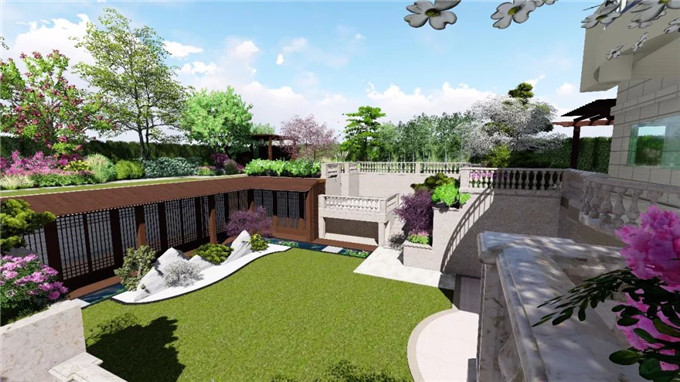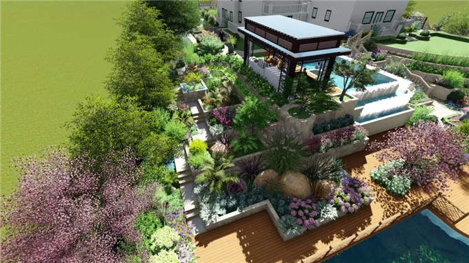 后院考虑到原有的地形高差较大,这也正适合布局成意大利台地园。高处为休闲区和大型无边界