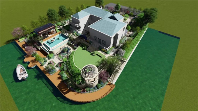 采用新中式设计风格,充分考虑人与自然的关系,把自然的山、水、植物完美融入到私家庭院中。