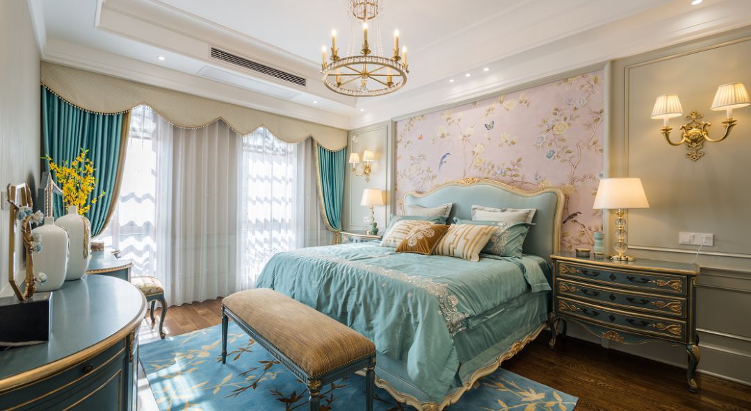 当下最流行的颜色被设计师运用的淋漓尽致,主卧的主打色是薄荷蓝,包括床品,窗帘,地毯以及粉红色的花鸟图的背景墙也体现了女主人喜爱温柔浪漫的法式空间。