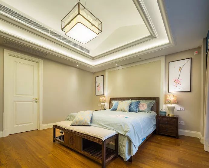 象征美好纯洁的荷花挂在床头两侧,贯穿整个新中式空间的纯美,点缀着整个空间的中式文化气息。