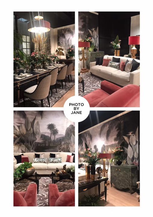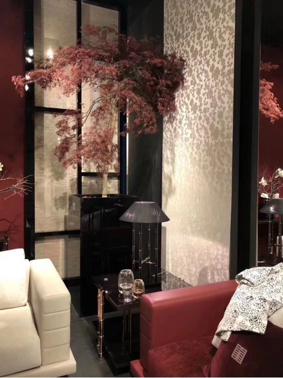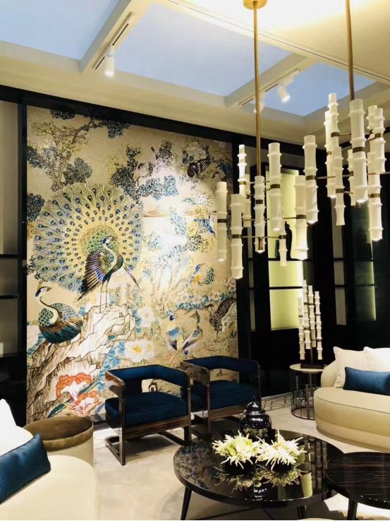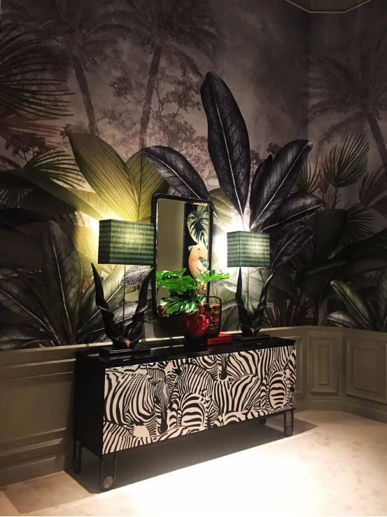 国外设计师对于东方元素的热爱在米兰展上也可窥见一斑,壁纸上的孔雀开屏图、